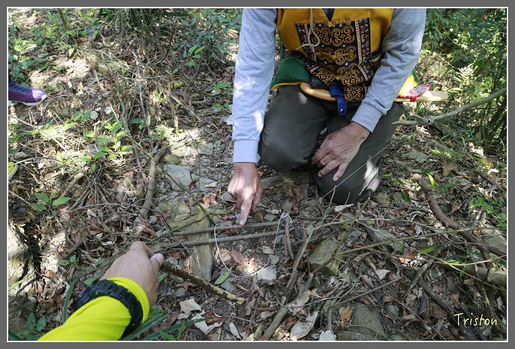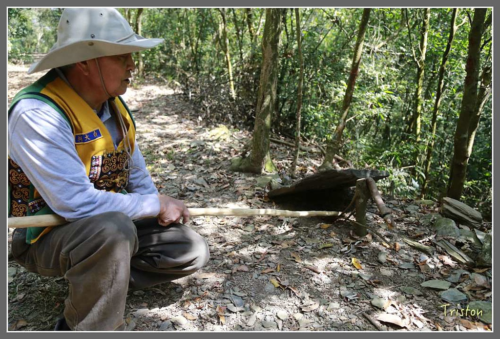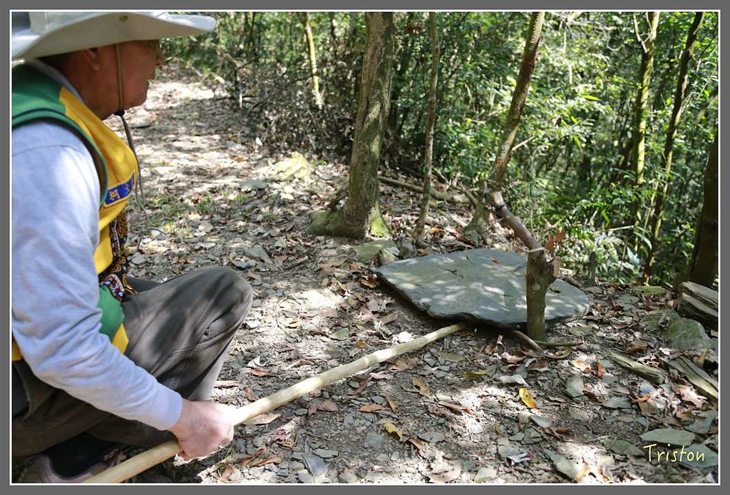 獵人步道有不同的陷阱,再來上場的是壓扁陷阱,用動物的習性來捉飛鳥或鼠類。當鳥或鼠類走過來覓食時,這塊石板陷阱一倒..