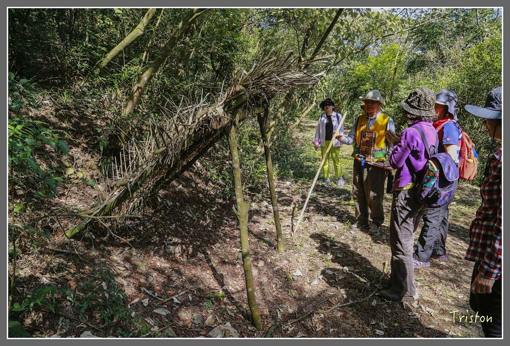 山徑上有一平台有捕捉熊鷹的陷阱,本來設計在樹上的陷阱為了解說方便,被架置在地上。捕熊鷹會以松鼠尾巴為誘餌,當風吹動,熊鷹以為是食物,就上當了。抓熊鷹是為了取尾羽上最長的一支羽毛,做為部落貴族頭目配戴,熊鷹羽毛上的的八個三角形斑點,原來是百步蛇所形成的斑點,所以熊鷹一直是貴族(頭目)和英雄的象徵。不過由於屬棲地的大幅減少和獵人的捕捉,熊鷹瀕臨絕種。雖然依據「野生動物保育法」,熊鷹屬於第一級「瀕臨絕種保育類野生動物」,只是在台灣山區,「野生動物保育法」向來僅供參考啊!