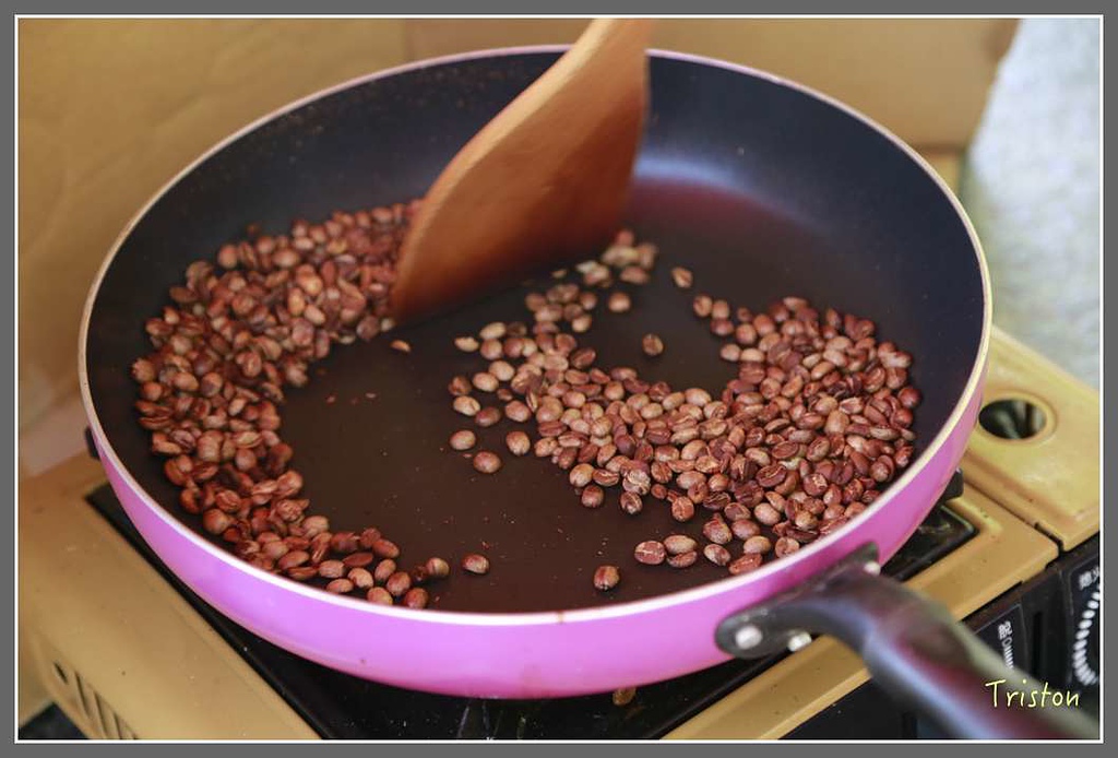 小火烘炒的過程,有點像炒花生,如爆米花會有霹靂啪啦聲,慢慢地會有陣陣焦糖甜味的香氣瀰漫,不過曉晨說那並不是咖啡香,只是堅果類的油香吧!