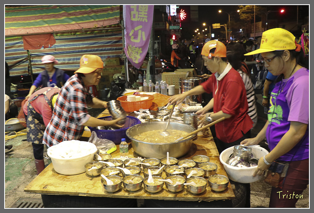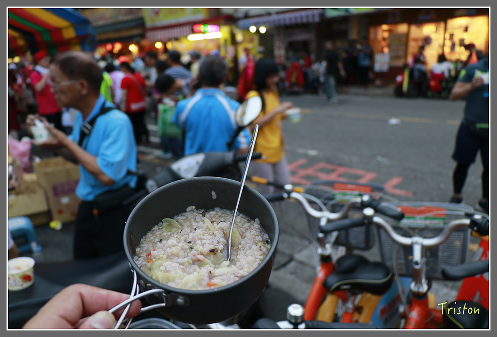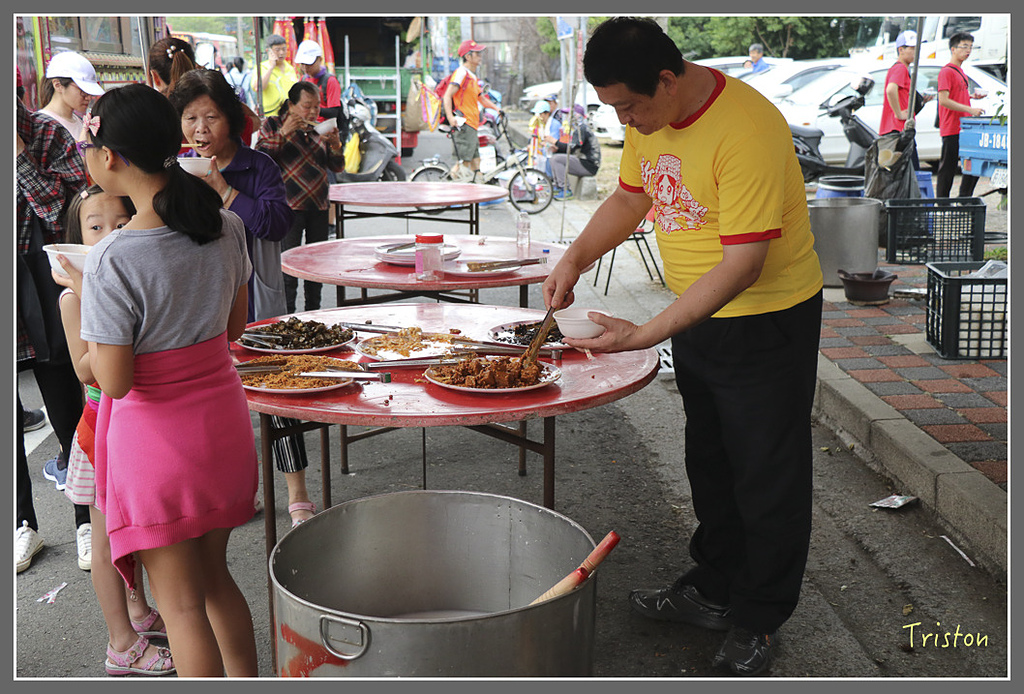 在廟裡聽到廣播,停車場有供應素粥,歡迎來往香客信途前往,我們也就老大不客氣的過來排隊用餐了!在這裡,真的可以感受到台灣人善良熱情的一面,很多人默默都在為彼此付出,只是方式不一,大部份的台灣人很單純,用一個共同的口號就會團結在一起,也會更容易凝聚在一起---媽祖或政治吧.....