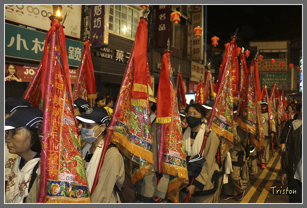 繡旗隊,都是由「信女」許願的人員組成,身穿著特定的灰色號衣"制服",有老有少,每年農曆1月15日「元宵節」在大甲鎮瀾宮排隊登記,大部分都是為家庭、丈夫、孩子來許願、祈求,一路上雖然有大卡車可以休息分兩班輪班替換,但要跟著走九天八夜,真的要有強烈的信念與堅強毅力!