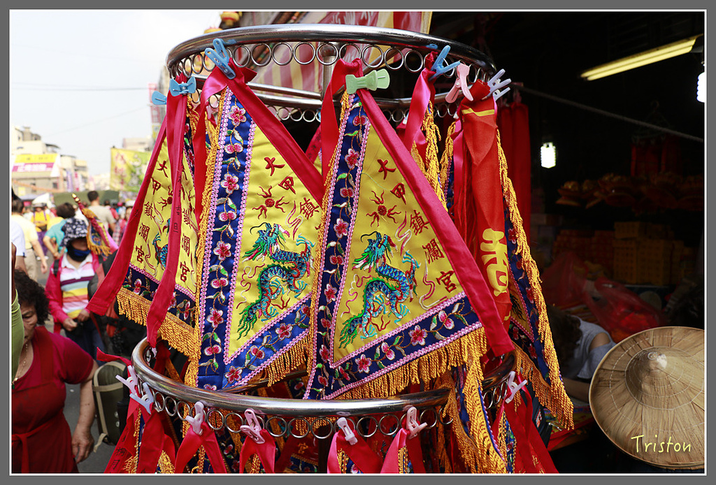大甲的街頭人潮洶湧,許多人背包上都插著一個紅黃色的繡旗,我一度思考要不要也要供奉一支進香繡旗呢?但之前看資料,似乎把進香旗請回去後,除了要放在神明廳或高處供奉外,還有不少的禁忌要遵守,所以雖然看起來繡工精美,但我還是放棄吧!後來在路途上和其它信徒聊天後,又有一點點小小的後悔!但誠心就好啦!天若有靈,應不會執著於此;我心若誠,自和上天有感!