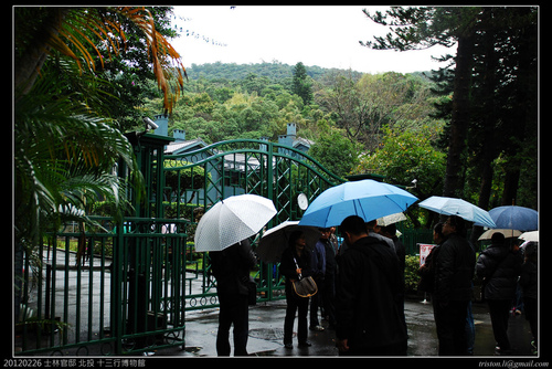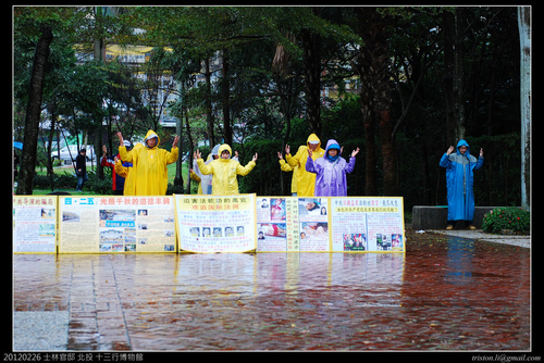 直驅士林官邸,鄉下人進城就是俗,花了好大工夫才找到停車場,冒著雨一到大門日就看到法輪功學員,我還以為是台北市政府裝置藝術咧!一動也不動。真令人佩服啊這群人,這麼冷的天氣,還下著雨,他們卻可以自動自發(莫非有股力量在背後....),在阿里山上或其它陸客出現的地方,也可以看到他們的身影。真不知道是什麼力量和信念驅使著。