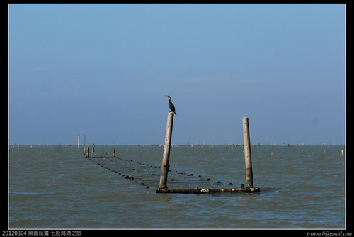 蚵架上站了一隻鸕鶿,這就是我們一般常稱的魚狗或魚鷹,就這樣站著,竹筏轟隆隆的過去也不以為意,想來看遊客也看得多了。