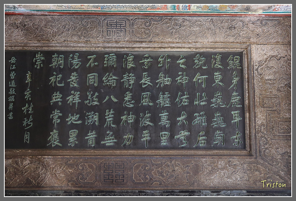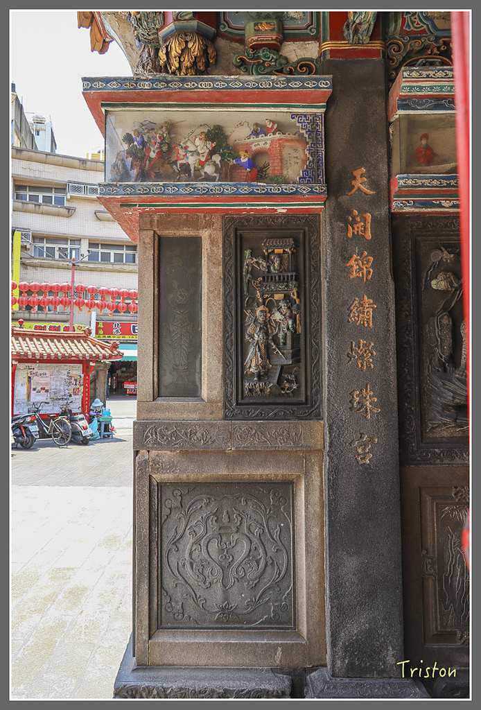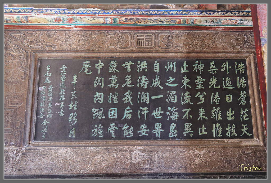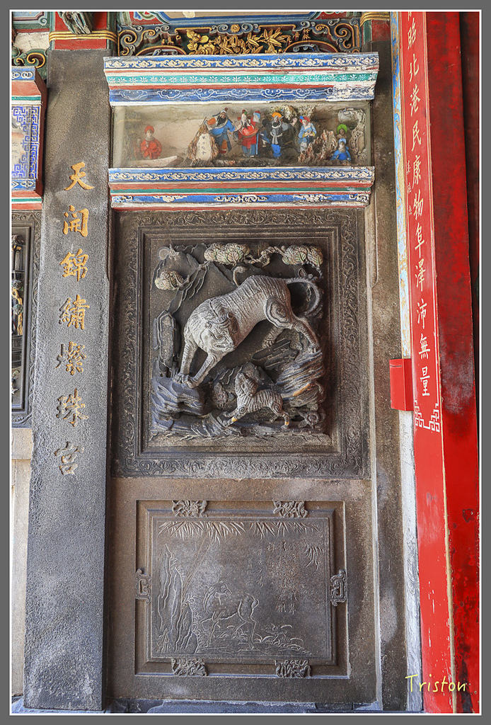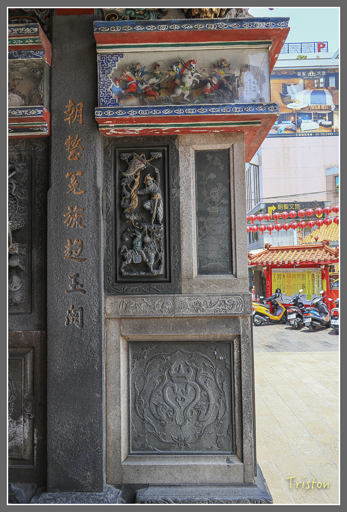 左右側牆有詩,因為北港媽祖曾駐輦金唐殿、時任蕭壠庄長兼任金唐殿廟頭的黃深淵,與台南廳山仔頂林阮金共捐石碑給朝天宮。在北港朝天宮三川門龍邊入口門旁