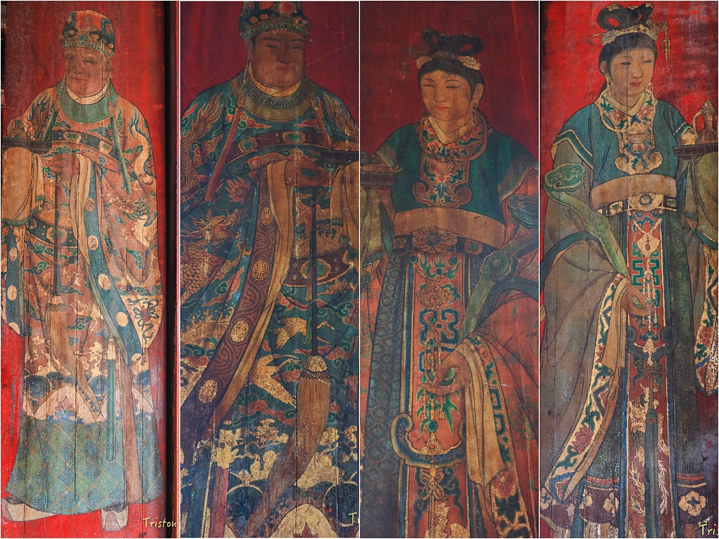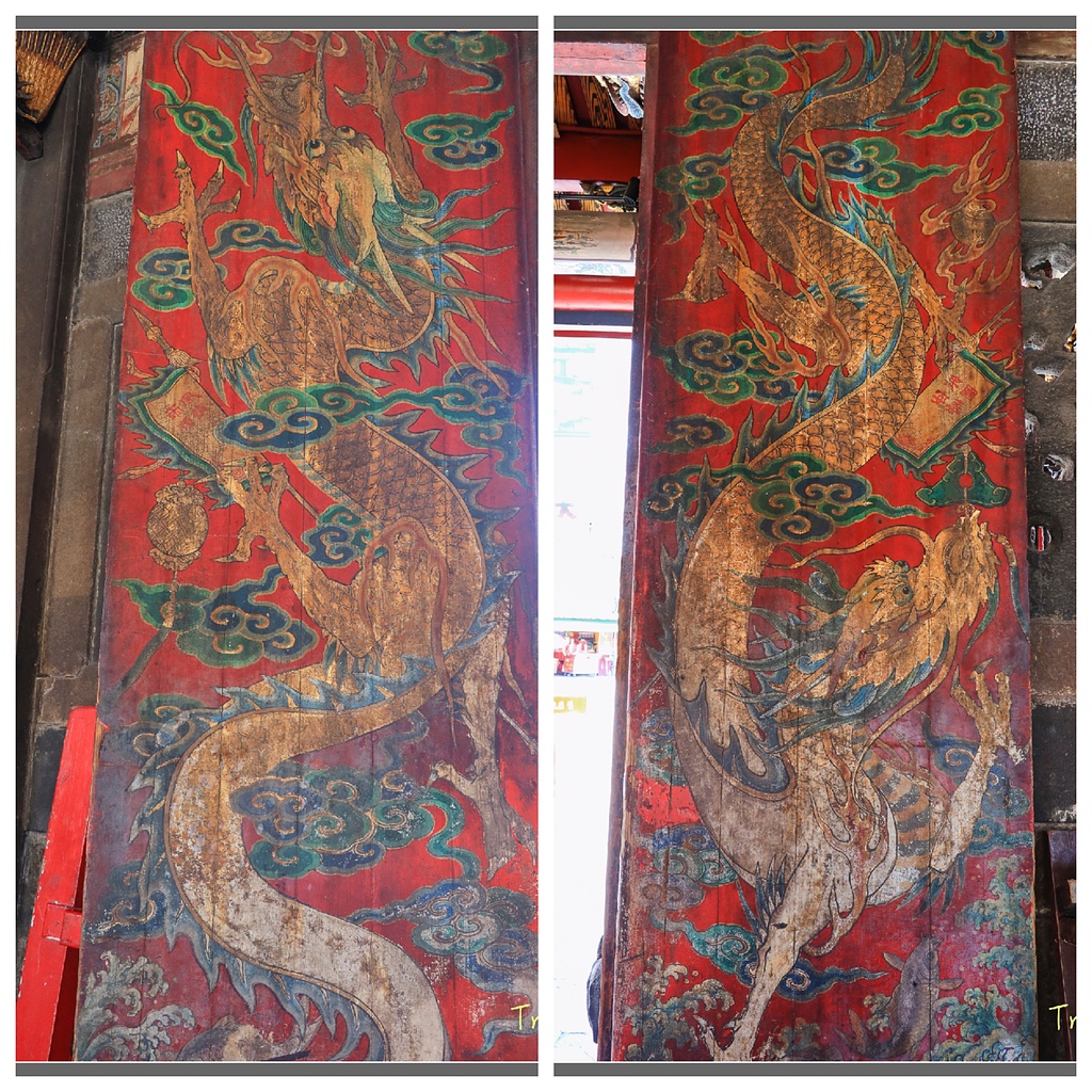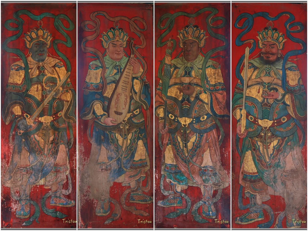左右龍虎門四面門扇則是陳壽彞所繪的風調雨順四大天王,可以和台南開元寺蔡草如所繪的四大天王做一比較,也可和日本東大寺的四大天王木雕相比