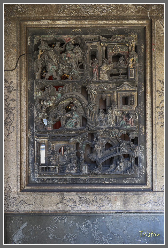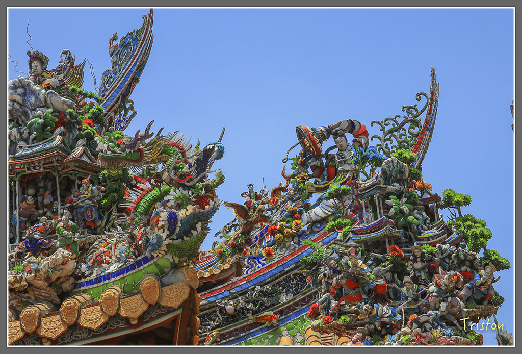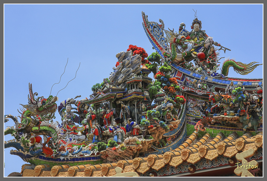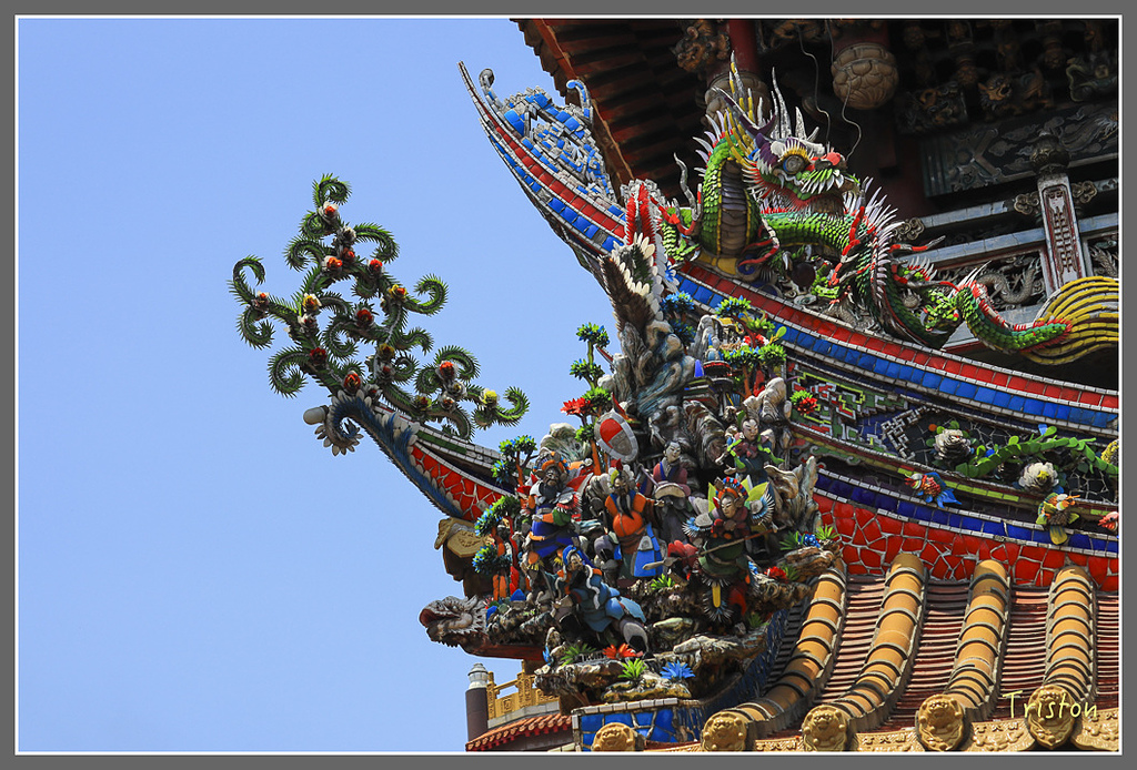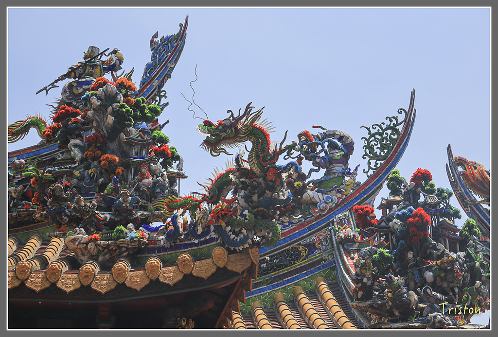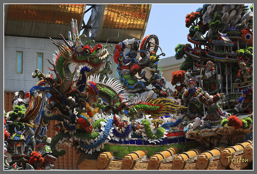 三川殿龍堵,其上剪黏是江清露在1963年的作品,江清露師從洪坤福,作品大多在台灣中部