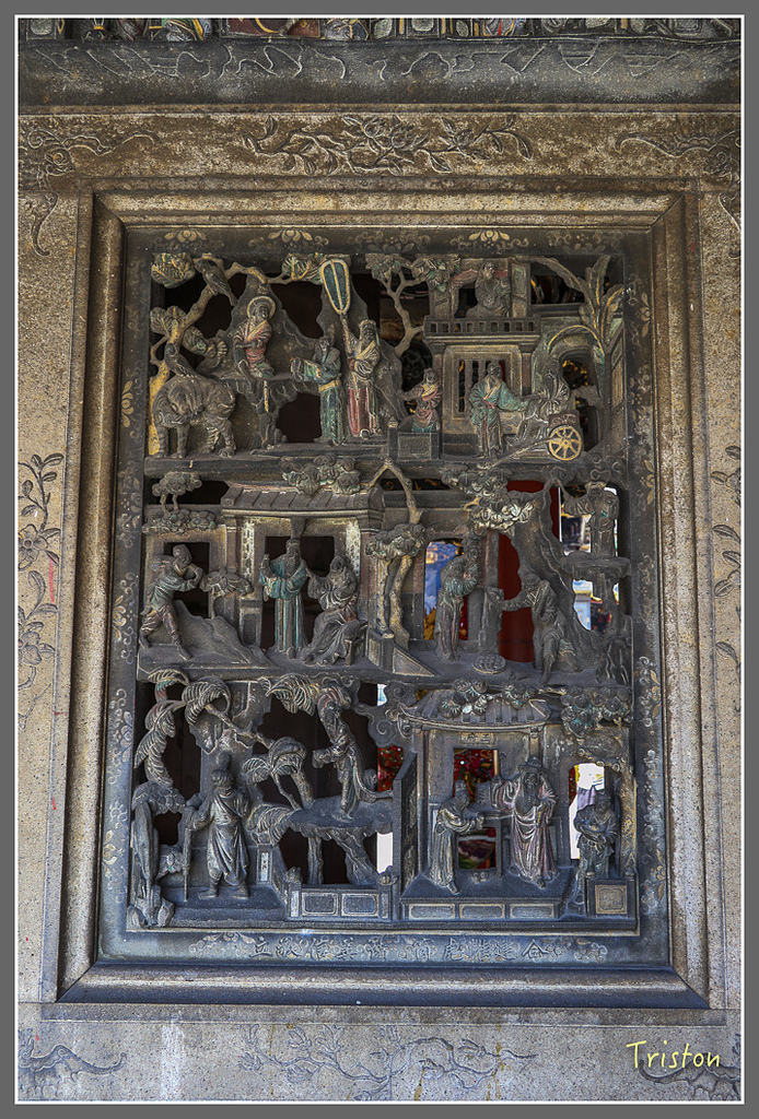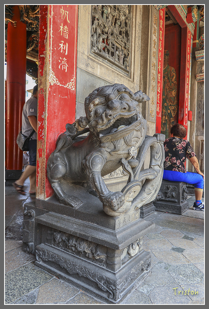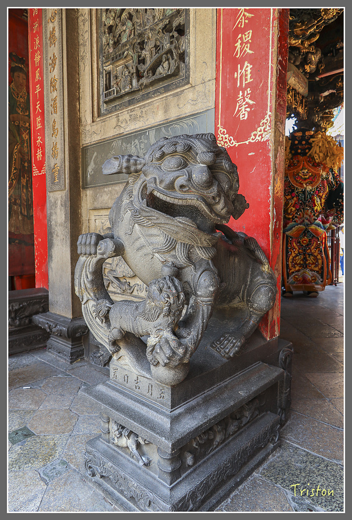 小的一對則富有很高的藝術價值,是清咸豐二年以青斗石刻製,形如幼獅,身軀嬌小玲瓏,但體態輕巧。門柱上刻有朝褒聖德,天錫母儀