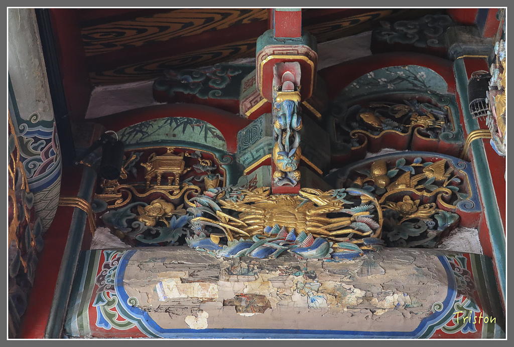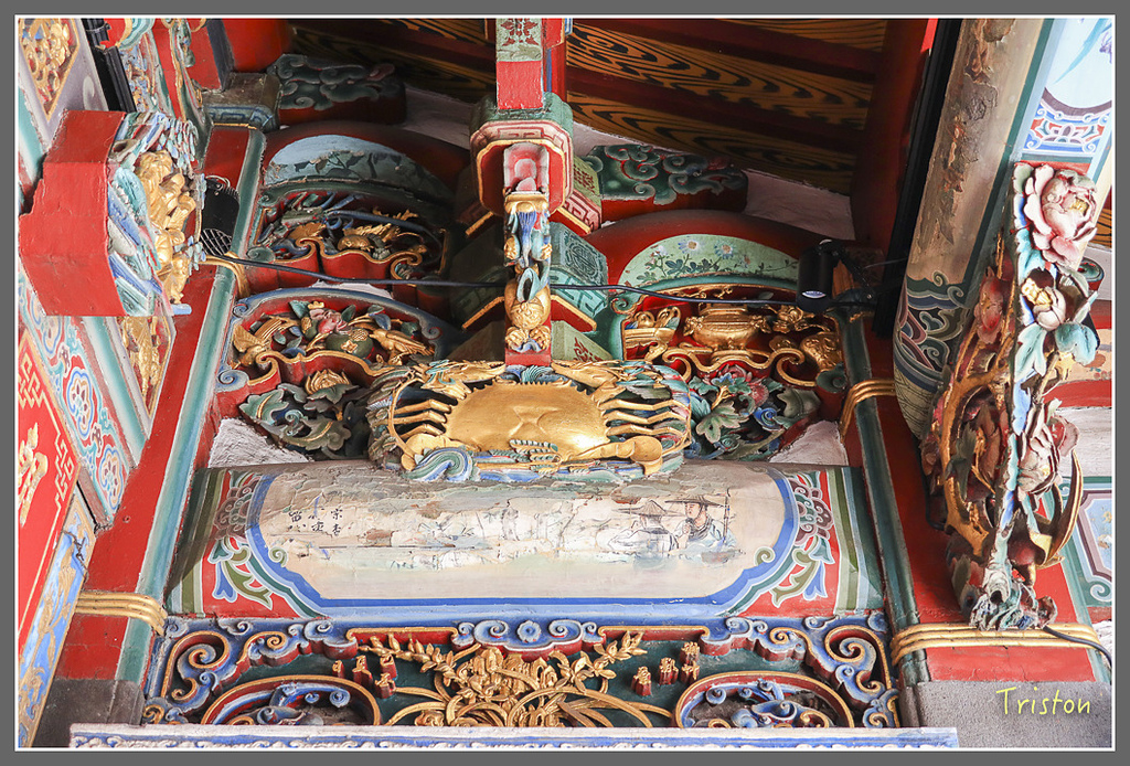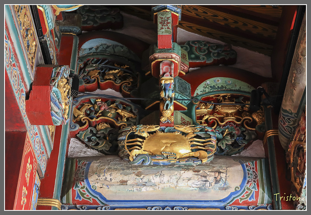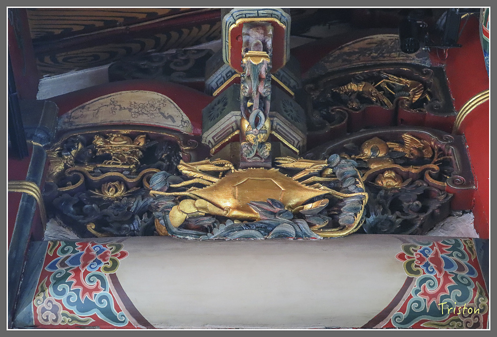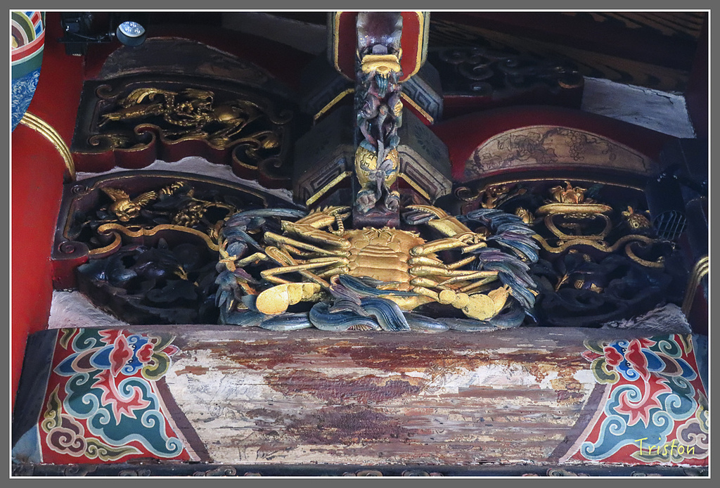 三川殿外側托架上上左右各有一隻螃蟹,上面客寫著三元及第,以示"高中科甲"的意思