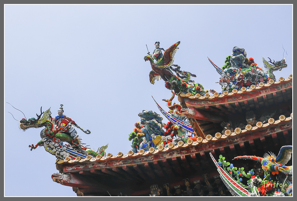 入得廟埕,中央的「三川殿」較高,為中軸的主要入口。北港朝天宮的三川殿為陳應彬(1864-1944)所建,三川殿的木結構被視為臺灣寺廟之典範。。左翼為龍門,右翼為虎門,合稱為「龍虎門」或「五門」。一般進廟朝拜,要從龍門進,而虎門出,取「出將入相」之傳統。總不能羊入虎口吧?中脊上的天宮賜福剪黏是名匠江清露的手筆。天宮賜福旁為旗球、㦸磬(祈求吉慶)