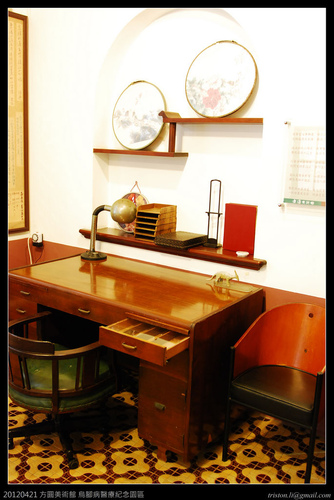 老鄉長的書房常態展出故居文物,包括許多珍貴老照片、老書桌、舊檯燈、處方箋、詩句、手稿、咾咕石石雕及其他生活物品,