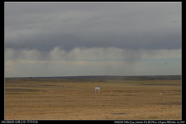 路經卡拉麥里蹄類動物保護區,遠處看到了幾匹野馬和駱駝,但竟然下起雨來,當然這種雨和台灣的雨無法比擬,更何況這當下台灣正在泰利颱風的警報區內,不一會兒,車窗上的雨滴就全蒸乾了。遠處的雲層也可以看得出來正在落雨,但似乎在半空中雨滴就被蒸發了