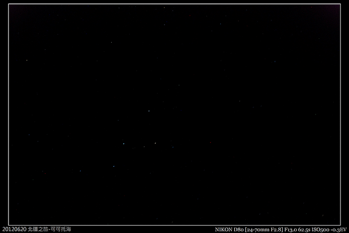 天池標高2300多米,晚上挺冷的,果然是標準的大陸型氣候,半夜三點醒來時還興沖沖地要拍什麼星星,一出氈房,腳架一立,冷的發抖,唉,算了吧!結論是,別拿自己未來幾天的身體擔保,回去睡個飽比較實在,腳架和B快門就此塵封......只留下一個不太明顯的W型仙后座和很像灰塵的北極星,這裡是北緯43度,北極星仰頭可見!