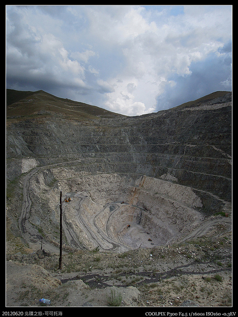 這是有名的可可托海三號礦坑,其實阿爾泰在蒙古語就是金山的意思,除了產黃金,還產鈾。聽說可可托海三號礦坑原本是高出地面三百多米的山,但是挖了四五十年已經挖到地下一百多米,產卅多種礦,在中蘇交惡期間還靠採礦還了許多外債