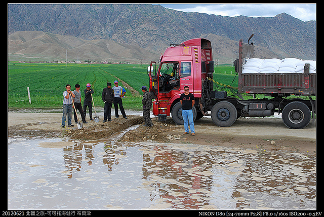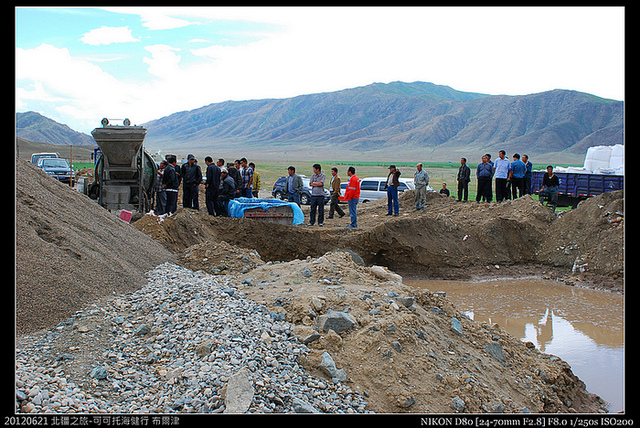 有沒有搞錯啊,大馬路在修路,便道又挖了一條溝,這怎麼過啊!這可是能離開可可托海的唯一一條路,兩旁全是農田和泥沼,我這時真的了解到,原來"此路是我開,留下買路財"這句話是真的,我們台灣道路四通八達,你堵了我這條,我往別條走,想要我的錢門兒都沒有,這裡不行,你還非得從這邊過不行,不給錢就堵了!