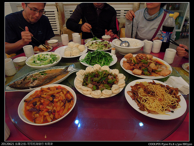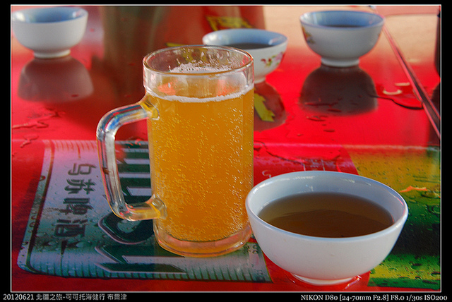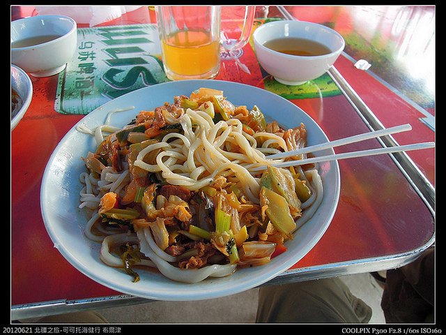 出了可可托海,到鎮上剛好中午十二點,再過去的路沒有街鎮,所以要在鎮上吃中餐,不過這時候卻沒有一家飯店是開著的,才十二點,新疆人是下午二點吃中飯的啊!這樣就好像在台灣十點就要吃中飯一樣,當然沒人賣,導遊只好請一家看的到人的店面央請他們幫忙下些麵湊和著吃!