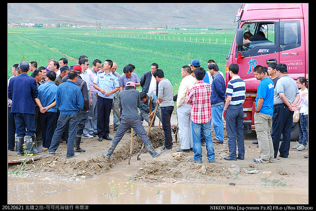 僵持了廿多分鐘,慢慢我們搞清楚了狀況!原來這塊地是個三邊是山,一邊依水的大盆地,三邊高一邊低,原本雪水溶了和雨水下來都會往水邊流去,但是路政局修了這條公路後,水流就堵住了,半邊的麥子就慘了,一下雨或雪溶就淹死麥子,這裡夏天才三四個月,今年不收成就什麼都沒了。結果政府說要這裡修橋,涵洞橋修了四年還沒修好。年年如此,哈薩克農民求訴無門,麥子每次都積水淹死,前兩天又下了雨,農民因為道路堵住了水流,又擔心一年一收的麥子又得淹死,所以索性在大路上挖溝放水,把可可托海唯一出口的公路堵住,反正就是要把事情鬧大上面才會關心。交警啊!路政啊!來了也沒用,付不出錢唄!只得等,等上頭有錢的來處理!。導遊說這就是中國的現況,政府搞得受委屈的人民無處申訴,只得上訪申冤,要不就挖溝堵路,把事鬧大。反正這個社會的就是有辦法的找路鑽,沒法子的只好等。等不下去了就拿命和你拚了....