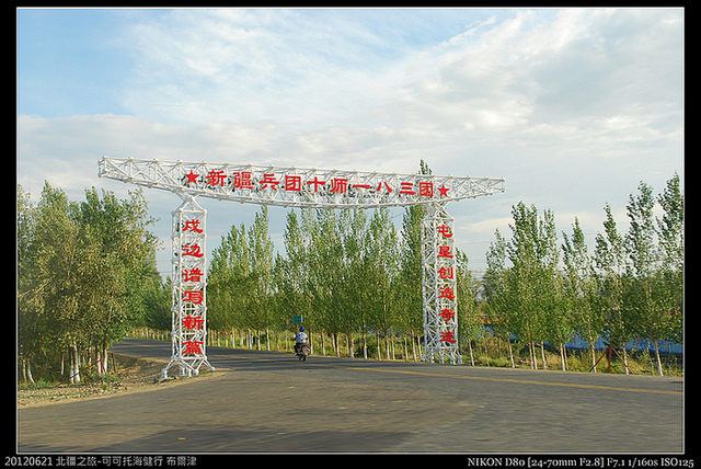 即將進入更西北的北屯地區,這裡的道路邊開始出現一些師團連等軍事單位的標誌,但並不是現役解放軍的駐地。導遊解釋說這是西元1949年,新疆和當地駐軍簽署和平協議解放後,解放軍的十個師在王震將軍帶領下,就地解甲屯墾,組建了"新疆生產建設兵團",然後進行北大荒的開墾,半強半騙半哄的從內地又來了好多女知青和官兵組了家庭,繁衍了後代。可以說留在新疆屯墾的退役部隊,就像是台灣的榮民!這種大規模的移民屯墾政策,歷史上也都只會發生在戰亂後的開國之初,政府力量強大而且人民剛苦過願意為國家犠牲一切的時代。