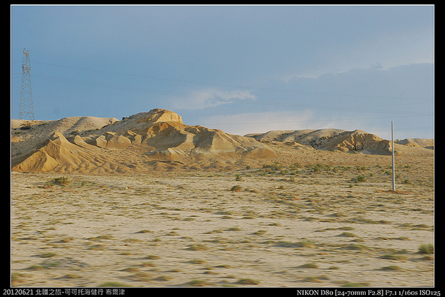 沙漠的路旁偶爾也會看到一堆堆的小黃土堆,一開始不知道這是什麼,後來發現有些新土堆前還插著木條,才恍然大悟這是漢人的墓。所謂一坯黃土就是這個意思吧!來年冬夏,雪溶沙積,這些埋骨異域的人也就萬古同塵,還諸天地了