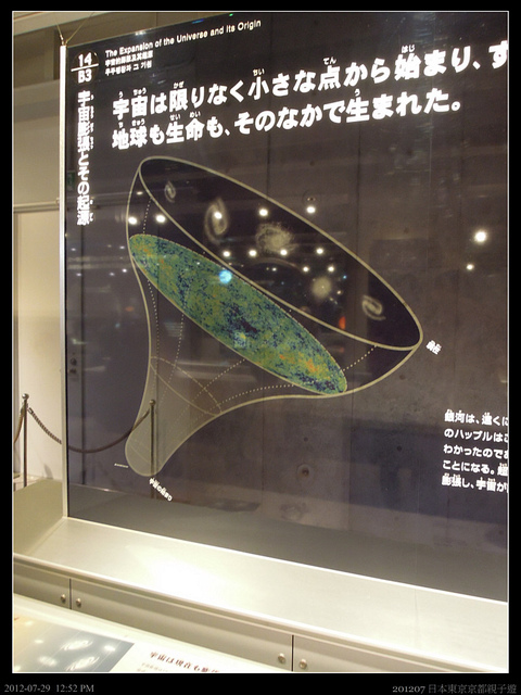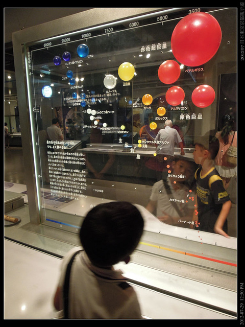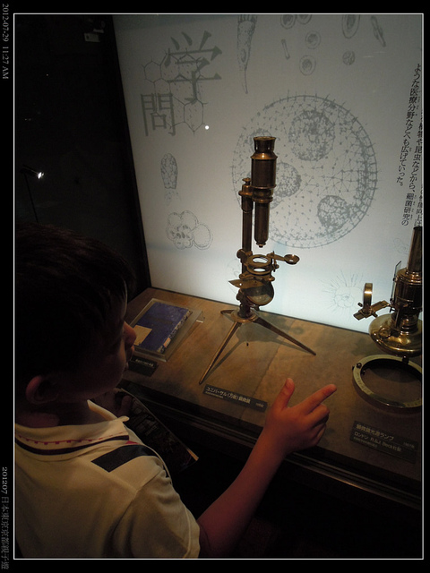 國立科學博物館分為本棟的日本館,後棟的地球館,還有一個特展區,這次的特展題目是元素展,介紹118種元素,我很意外許多中小學生也由家長或老師領隊前來,然後現場有許多志工和教授解說及實際體驗,我們呢!由於時間和老爸還無法用小朋友的認知語言來解釋,就沒參觀了。其中有一部份最讓我感動的是,日本中學生在中午時間就在樓梯間安靜的休息和吃著自己帶來的飯糰和開水,日本文化的深蘊的確是我們望塵莫及的。