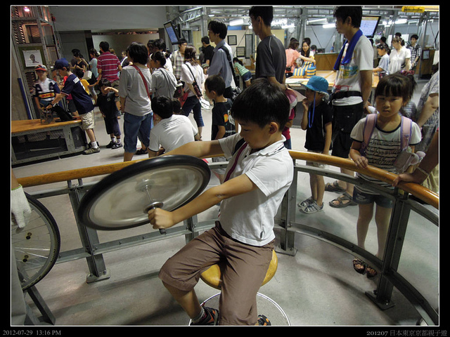 利用車輪的轉動產生的角動量使得握著他的小朋友明顯感受到向左轉或向右轉的動量...有趣的動手做..兒子很勇敢,雖然聽不懂日文解說員的內容,還是很堅持要上去試試看。