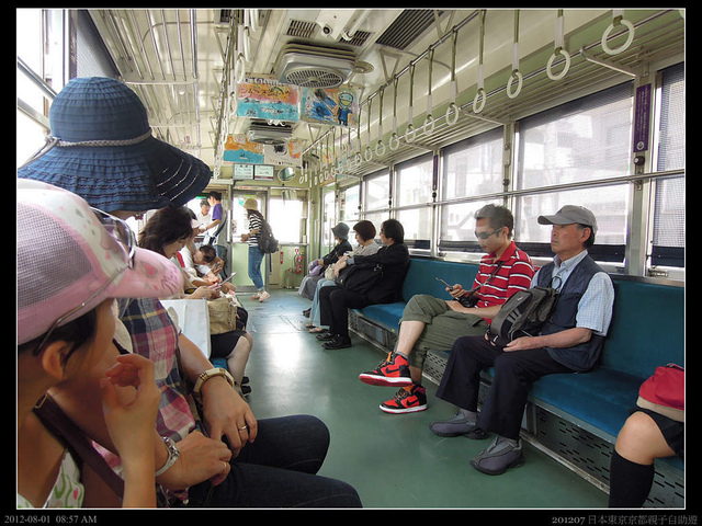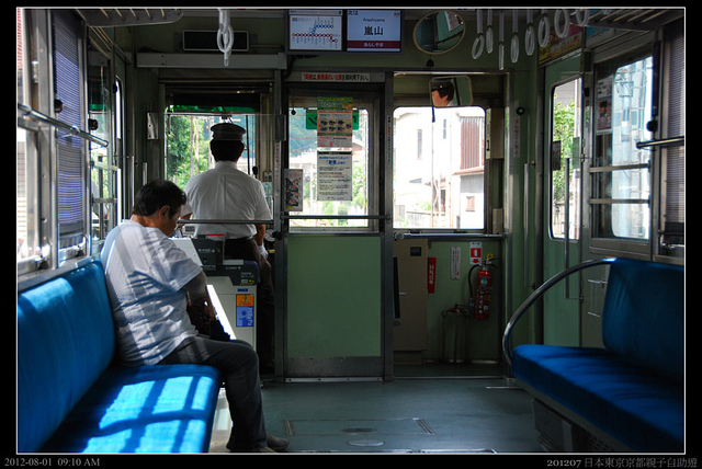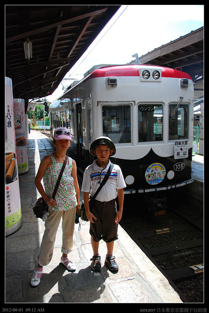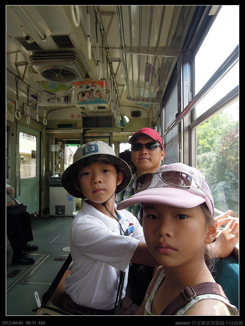 嵐電列車很可愛,只有一節車廂,車廂上頭掛了兒童的畫作,暑假期間,嵐電也有ECO-SUMMER的活動,所以小朋友搭車也不用錢。我們由四条大宮站上車,一直搭到最終站嵐山。