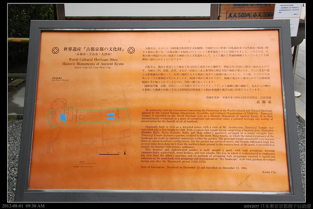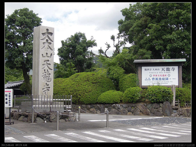 天龍寺可是世界文化遺產,以日式庭園著名,以前讀過的資料是四月的櫻花和庭園很有名,Sharo說天氣熱,又沒櫻花可以看,所以就決定不買票進去庭園。門票是500JPD/人。