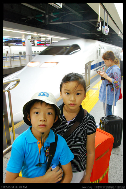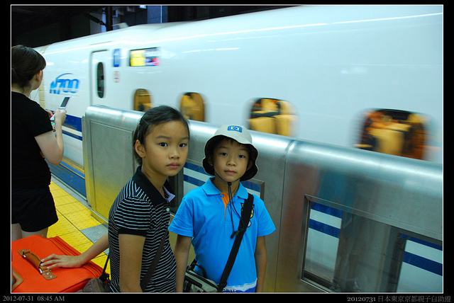 由新宿往品川後,一下山手線沿著指標就可以到達新幹線的月台,原本我們想要搭のぞみ的N700型列車,它比我們台灣高鐵的原型ひかり號更快更酷,不過可能這款車型較新,速度較快(由品川到京都約2個小時10分鐘),搭乘的人很多,自由席幾乎都滿了,而我們又希望坐在一起,所以就轉向月台的另一側,搭乘較舊款的ひかり號,這也是台灣高鐵的原始設計基礎型,它由品川到京都約2個小時35分鐘,停的站較多,但是一樣的票價,又可以坐比較久,小朋友也挺開心的。