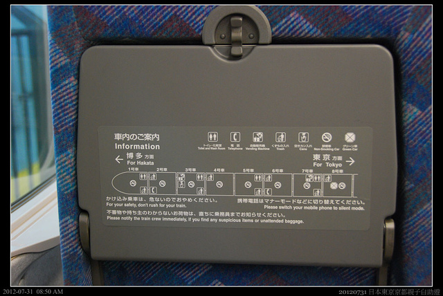 幾乎和台灣高鐵一樣的內裝,如果不是"博多"和"東京"的字樣,還以為是坐在台灣高鐵上咧!