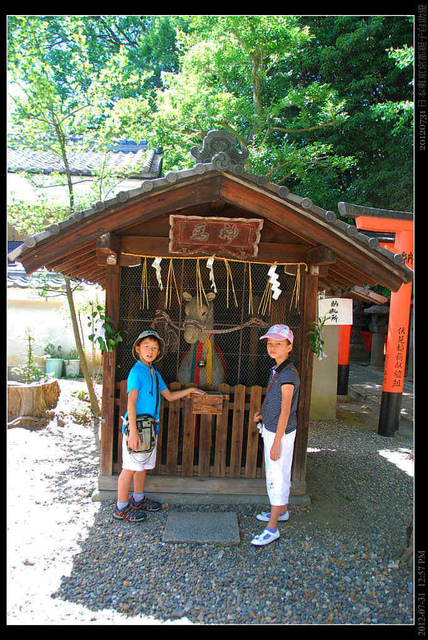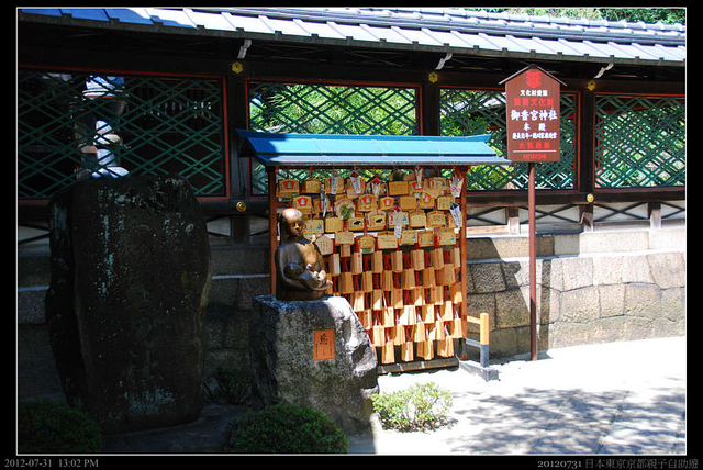 日本拜拜是先要丟錢到賽錢箱把箱子丟的鏘鏘響(先通知神明),才能搖鈴祈願。給了小朋友一些零錢,不過小朋友不太會投,就沒其它日本人投的鏗鏘有聲,鈴也搖得沒人響,想必,沒有投多一點錢,神無法"見錢耳開""耳聰目明"了。