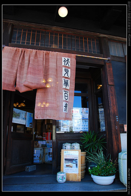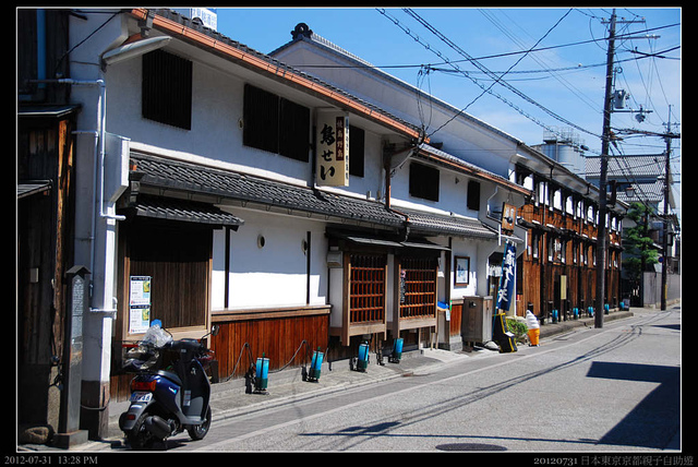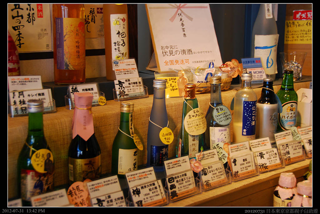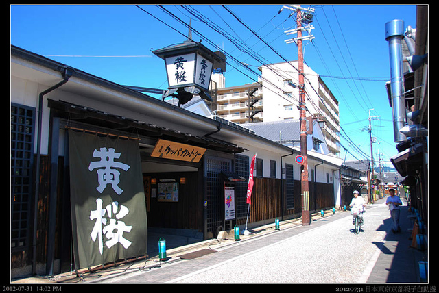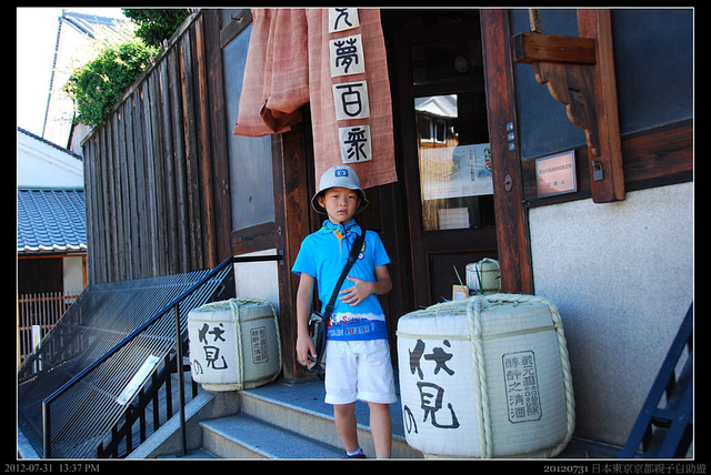伏見桃山最有名的是造酒,下午天氣熱沒什麼人。我們沿街道亂亂走,晃到這間由著名清酒「月桂冠」在大正時代的舊總店公司辦公樓所改建成「伏見夢百眾」,其中大部份做為咖啡館營業,但其中一角則販賣當地地酒。