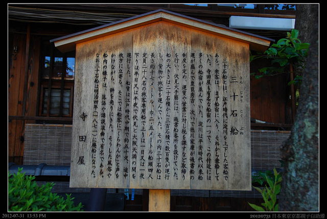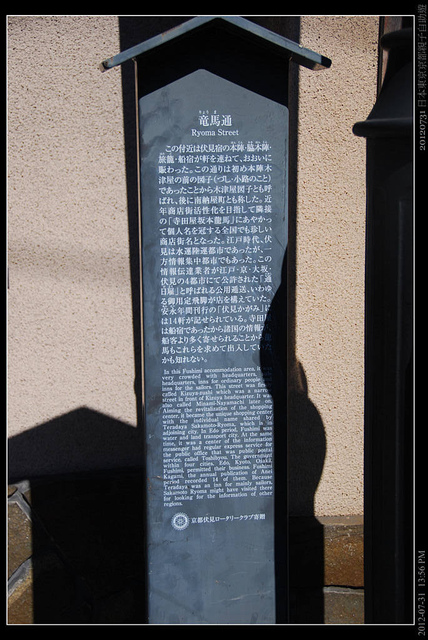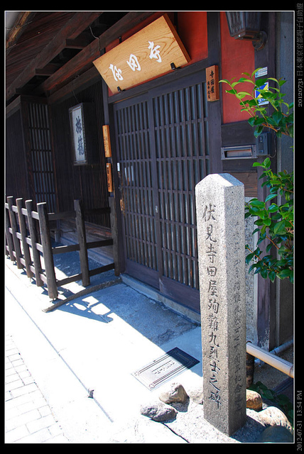 寺田屋,這是有名的歷史遺蹟,西元1866年,推行大政奉還的坂本龍馬和西鄉隆盛等人成立薩長同盟之後,在這裡受到幕府的襲擊,伏見奉行所的捕快埋伏在外準備逮捕坂本龍馬,坂本龍馬受傷逃離,卻有九名薩摩藩的志士被殺。
