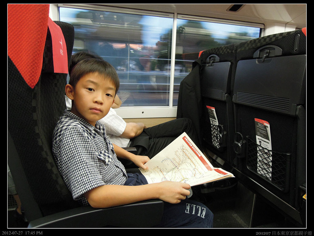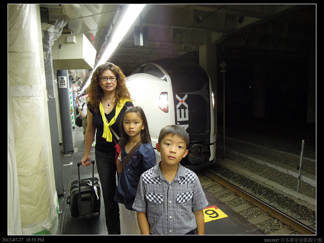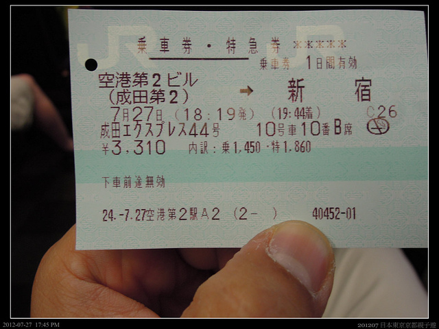 循著詳細而不會錯過的指標,不用功又沒精打細算,也因為和兩個小朋友,我們就沒買SUICA套票..直接在購票櫃台買票,上車了事。搭直達新宿的NEX特急列車。日本車票以往有些特急列車或新幹線的車票,包括了乘車券和特急券,現在好像在許多地方都合併了,其實如果可以只在車票中表示一種價格就好了,不然在自動購票機買票就要特別注意要點勺選"乘車券和特急券"的選項。要不就要上車補票啦!補票是小事,但是列車長在你面前講一大堆落落長的日文,如果沒兩下子日文實力或臉皮的話,可真會不知所措!