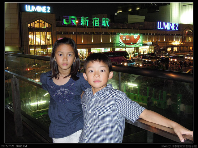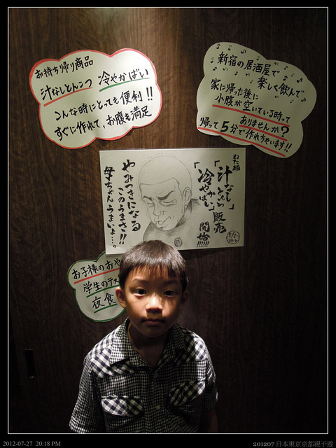 就不認真,連飯店的地圖都沒印,大約就只知道在新宿車站南口附近,日本那新宿車站,大的出口五六個,小的出口就不計其數!雖比不上大阪梅田車站的複雜,但也是三度空間加迷蹤陣,沒經驗的話很容易搞得昏頭轉向,我上次還在挖的工地和地下道,現在全變成露天廣場了。自恃經驗的下場就是一時之間也找不到飯店,只是沒想到天無絕人之路,這時竟然有人在旁邊用英文問我"May I help you?",這簡直太神奇了,要知道除了萬不得己,日本人是絕不輕易說英文的,如果你去麥當勞點餐,用英文點套餐出錯餐的可真的比用手指比的要高。沒想到在新宿車站前還可遇到一個好心的小姐,熱心的用英文問我們要到哪裡?其實我一開始真的有點小人之心,怕是詐騙,專門改拐騙我們這們閤家同遊,看起來又呆呆的台灣人。沒想到,她不僅幫我們找地圖,還親自帶我們走了老遠(大概六七百公尺啦)的路到飯店。途中,稍微聊了一下,原來她也是日本三一一海嘯的受害者,還用手機秀出她家鄉受災的相片,而且聽到我們是台灣來的還說台灣的救助當時幫了她家鄉很多,一直跟我們說謝謝!我還真的有點不好意思,因為當時我沒有捐錢,原本都準備好要捐了,但看到公司遞來的單子,主管還依職稱分配認捐金額,我一不爽之下就不樂捐了。真是歹勢!但她人真的很好,因為她說我的日文發音很道地,唉!真是不好意思,其實我認得的就那句。
