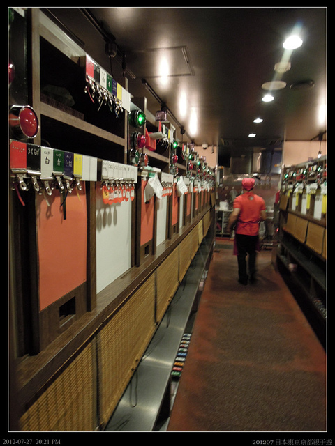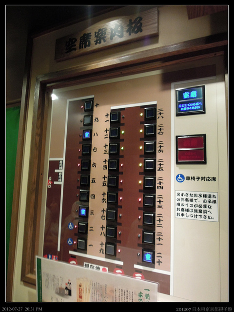 很特殊的設計,一個空席說明板讓你知道現在空位狀況如何,而且日本人真的很死腦筋,例如我們四個人,也要求要四個人合坐,但是現在如果有二個空位出來,他也不會讓後面的兩個人先去坐,他就一定等到有四個人的空位出來,先安置好了這四個人,才依序安排後面的二個人,這點我們這麼"聰明"的台灣老闆是絕對不會這樣做的吧!