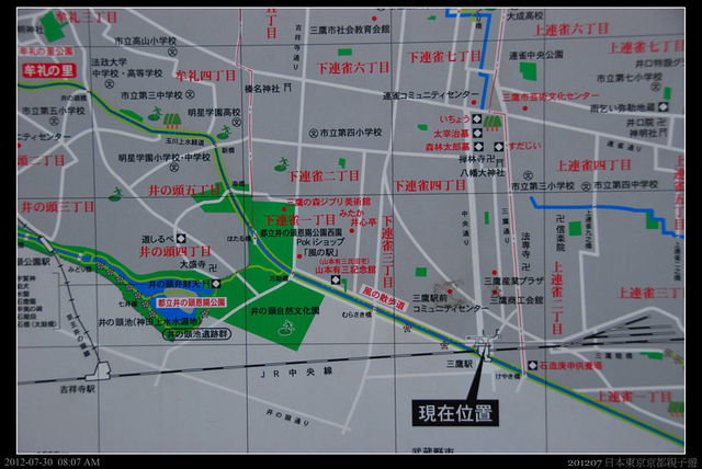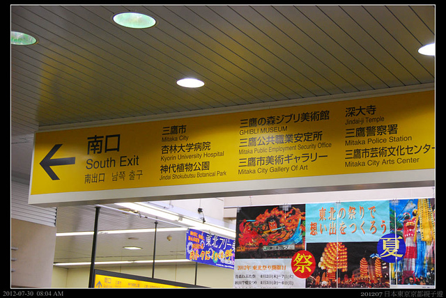 大約四五站就會到達三鷹站,一出車站,可以感受到三鷹迥然不同於東京市區的生活步調,學生,主婦占據了車站的大半,步伐節奏變得悠閒緩慢,佈告欄四處張貼著夏日活動的海報,天花板上的標示指向著各色各樣的藝術文化設施,這是個以生活為主的住宅型都市。