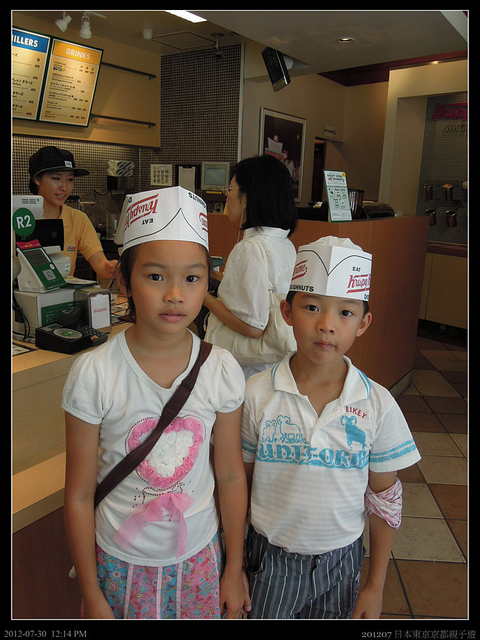 回到新宿,下午茶終於要吃那家聽說很有名DOUGHNUTS & COFFEE,這次我學乖了,寧可用不太好的日文,也不月什麼英文了,果然奏效,店員不厭其煩的接受點菜,還送了兩個小朋友小禮物。雖然很好笑......