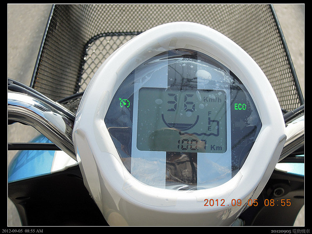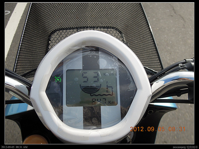 家中出發時的里程是74.9km,本人體重約80kg(這是重要參考數字,如果身輕如燕當然就省電多了,可惜我只有思緒如燕,但體重如牛)。由於我打算在天文台進行回程充電,因此一路幾乎都用speed模式前進,speed模式的速度大約可達50km/h,如果ECO模式只有30km/h。在市內,車多路小,其實30km/h就足夠應付,但也由於使用高耗電的speed模式,大約走了10km,電池指示降了一格。先前請教過同學,了解到電池指示是以電池的殘餘電流量測計,所以會呈線性下降,也就是每一格所代表的電量是一樣的,這樣一來,大約可以預測依目前隨你爽的任意加速使用模式,這顆電池大約可騎乘50km....