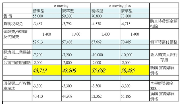 電動機車e-moving plus,價格比印象中貴一點,原價70800,扣除中央政府在貨物稅和經濟部的補助,還要57662元,這是在台灣各地都不會有太大變化的價格,但是縣市政府的補助就會差很多。像本人居住的台南市,雖然有民調第一名的市長,但是補助才2000,而最遜的新北市,卻有12000的補助,而老婆娘家所在的屏東,看起來很窮,但補助也有7000,所以如何找到"合適"的購買人,也會大大的影響到最終的購車成本。像我們家的電動機車是住在屏東的丈母娘買來送給老婆然後借我使用,所以她的實際購車價在五萬出頭,大約一萬七的補助款會在二三個月後退到購買人的帳戶。
