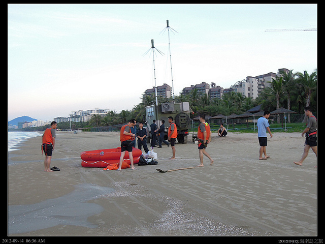海岸救難人員一早就展開演練,三亞附近是南海艦駐紮的榆林港,榆林港的歷史就不用多說了,當年從大陸逃難到台灣的外省人可在這裡留下血淚斑斑的回憶!