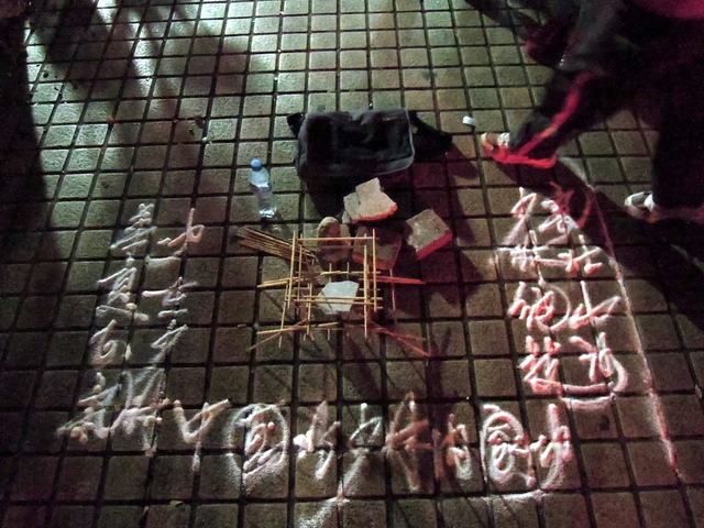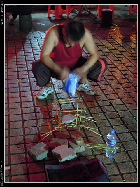 街頭藝人表演少林內功,他先用筷子排了一個架子,小有本事,但總不是這樣就收錢了吧!拿起一包看起來像洗衣粉的東西,在地上撒上"氣壯山河,少林絕技,功在少林,華夏正氣,中國北少林內家功",看來有門道哦!人群慢慢湊過來了,他一開始空手劈石,用了刴了好幾塊石頭,挺有看頭,再來好像要演練一指禪用指頭戳花崗岩!高潮慢慢來了,可是他又放慢速度,開始找理由什麼怕擋了人家的道,要圍觀者向前擠進,我心想,人多的地方還是少靠近為妙,說不定扒手就在其中呢!生了提防心,早早走了。