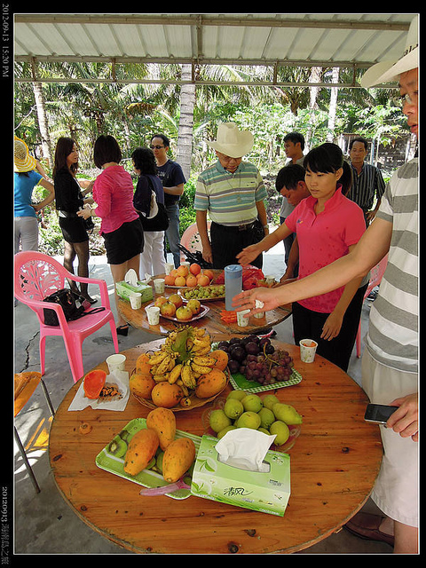 在椰子園裡,參訪她的椰子園,也品嘗當地水果。