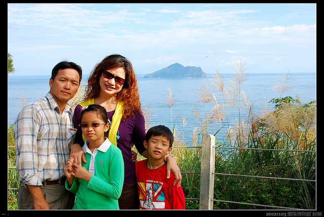 城堡咖啡廳實在太熱門,己經超越我對"咖啡廳"那種恬靜氣氛的想像,只得速速離開。山下有一個點,是通往飛行傘基地的入口,從這裡也可以清楚拍到龜山島,而來往城堡咖啡廳的人們多半驅車直上或速下山,倒沒有在這裡停留,所以輕易的立了腳架,拍了全家福照。