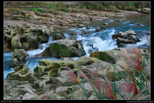 大約走個五分鐘,就可以看到河道上的壺穴地形,遠遠看可能不太清楚,壺穴是急流挾帶砂石在岩石河床上磨蝕而成的圓形凹穴