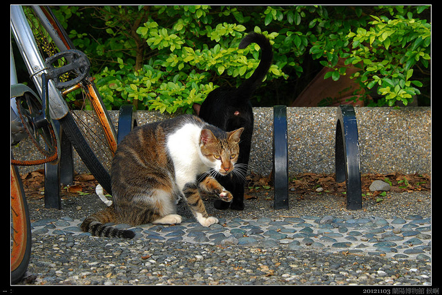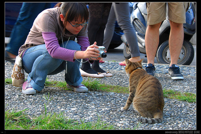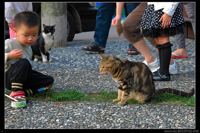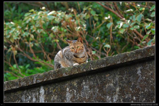 才剛進到人潮較多的區域,貓咪開始出沒,這裡的貓果然都是有練過的,看到人們拿著相機,大大一顆鏡頭對著也不怕,一付恬然自得的模樣...