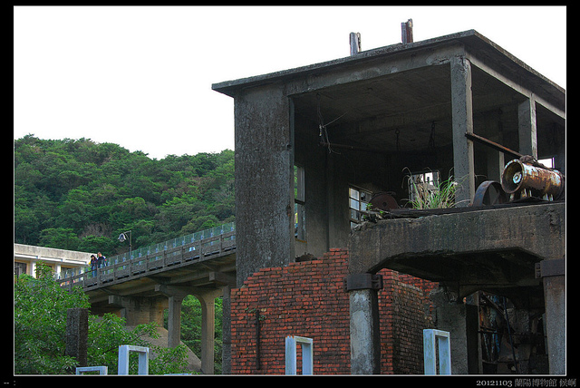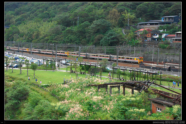 後面的造型獨特的大幅度跨拱是瑞三煤礦的運煤橋。瑞三煤礦是的全名是「基隆會社瑞芳三坑」,開採初期僅支援金瓜石、九份地區所需要的燃料,礦區範圍達1,852公頃,前身是日治時期顏雲年與日本人木村久太郎合辦開採的「久年二坑」。顏雲年生於瑞芳,他所屬的基隆顏家可是日治時期的台灣四大家族,他們不靠茶葉,不靠樟腦,卻是有名的煤礦聞人...