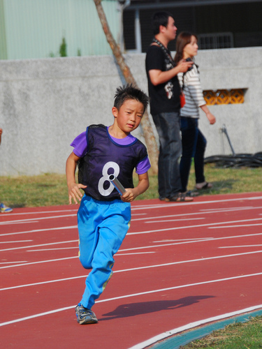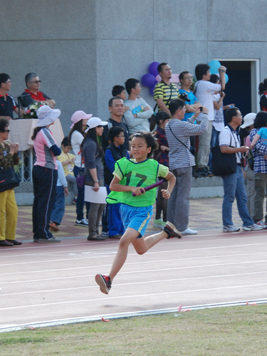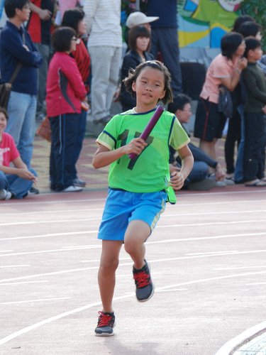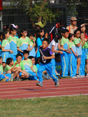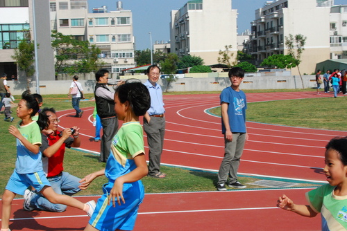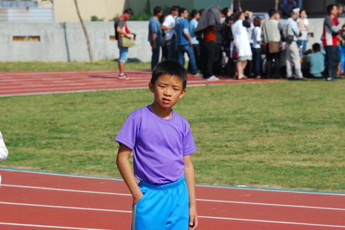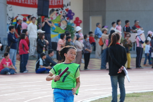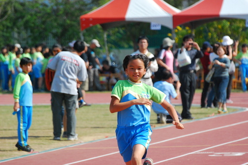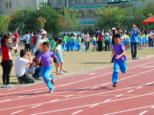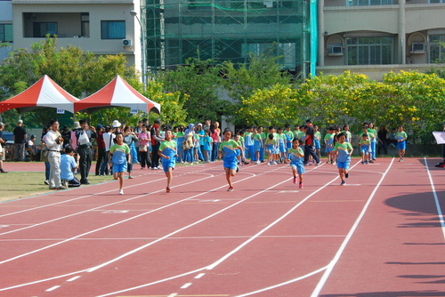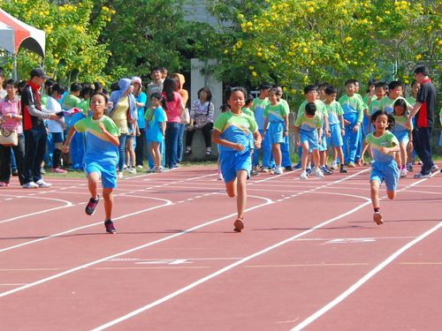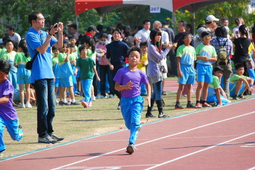 四年級六十公尺大家跑,姐姐聞槍起跑,隔壁的林庭芝和矮矮的陳沛馨好認真