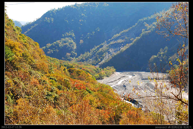 在觀鳥平台上可以看到橫在溪谷上的吊橋,溪谷間的林冠的葉片或綠,或黃,或橙,或紅,像是點描的油畫.....