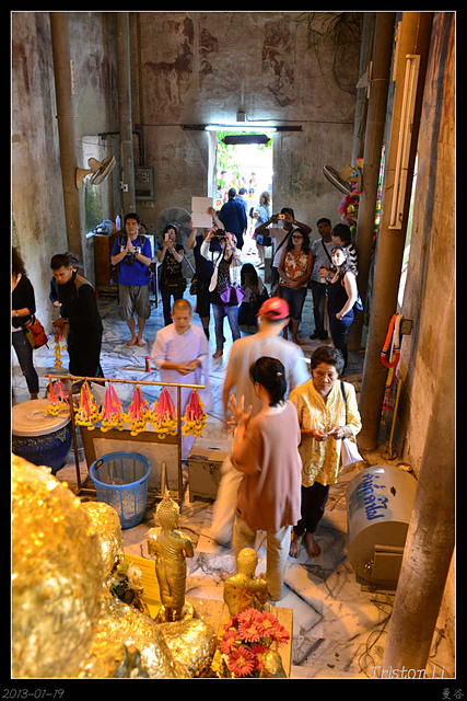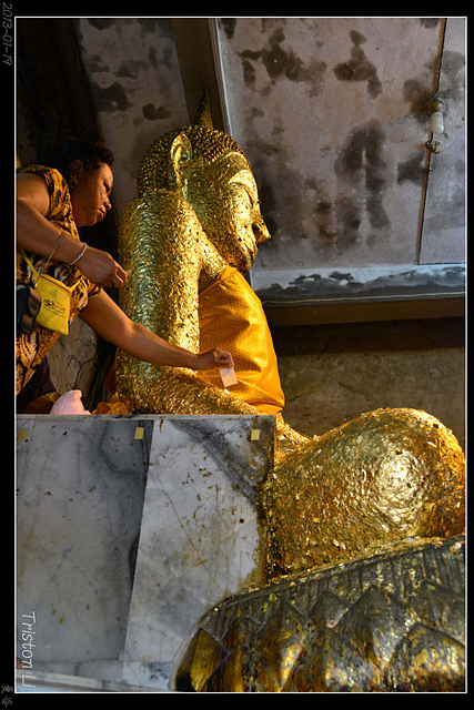 由廟外的小窗剛好可以仰望佛像。泰國人敬拜神佛的方式是向神像上貼金箔。中國人愛往自己臉上貼金,泰國人是愛往神像上貼金。