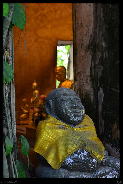 這裡叫樹中廟,不是眼前的這座大廟,而是旁邊樹裡的那間樹中廟。廟前有座銅雕,是泰國第三王朝的國王,祂是個華橋,鄭信。西元1765–1767年期間(清朝乾隆年間),緬甸和暹羅發生戰爭,1767年大城王朝首都阿育塔亞(Ayutayya)被緬甸攻落,四個世紀的大城王朝自此滅亡。但隨即緬甸為了應付清朝的入侵而將大軍撤回 (清緬戰爭),1770年,泰國將軍鄭信驅逐了緬甸軍隊,建立了新的王朝—吞武里王朝。1782年,泰國發生宮廷政變,鄭信被殺。從柬埔寨前線率大軍回京的卻克里將軍(拉瑪一世)掌握政權,建立曼谷王朝,就是延續至今的泰國王室,而現任的泰國國王是拉瑪九世。電影"國王與安娜"中,周潤發演的國王是拉瑪四世,安娜的學生就是拉瑪五世(1853年~1910年),名"朱拉隆功",是泰國有名的君主之一。